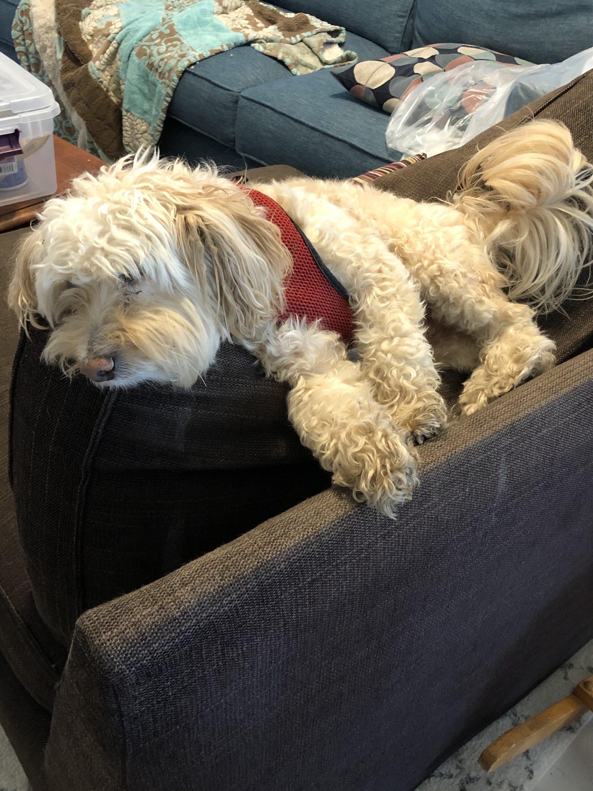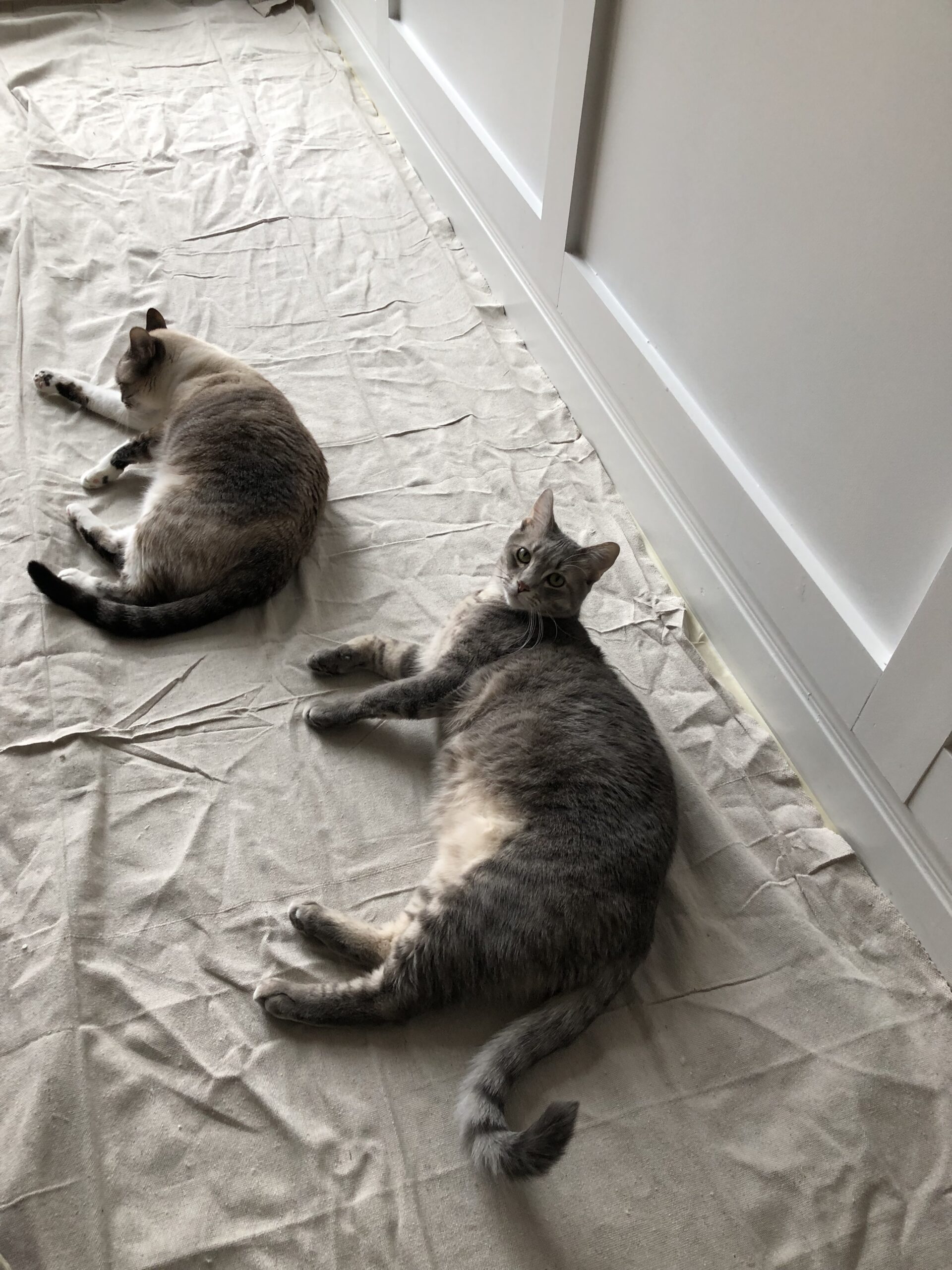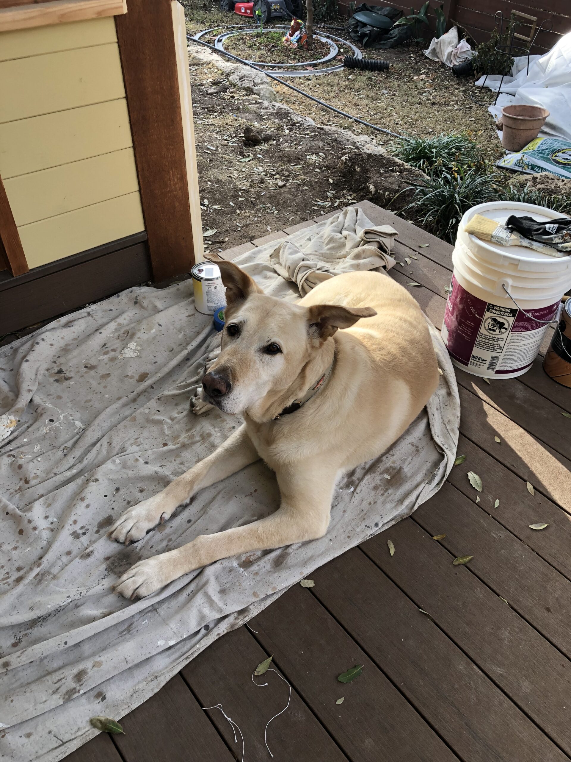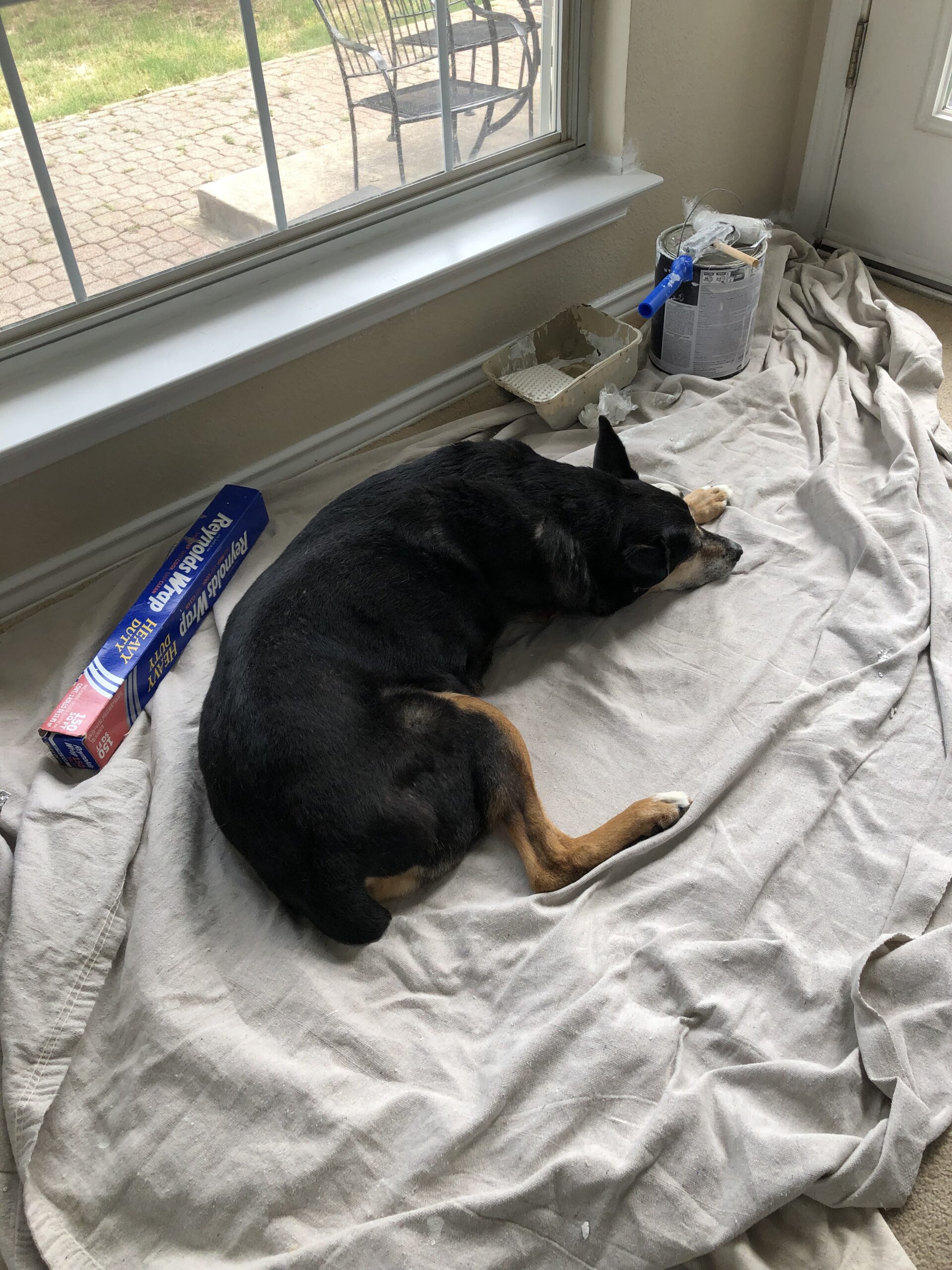 My drop-cloths are like welcome mats. Some hang out with me for a while. Others come by to sniff the previous dog’s scent.